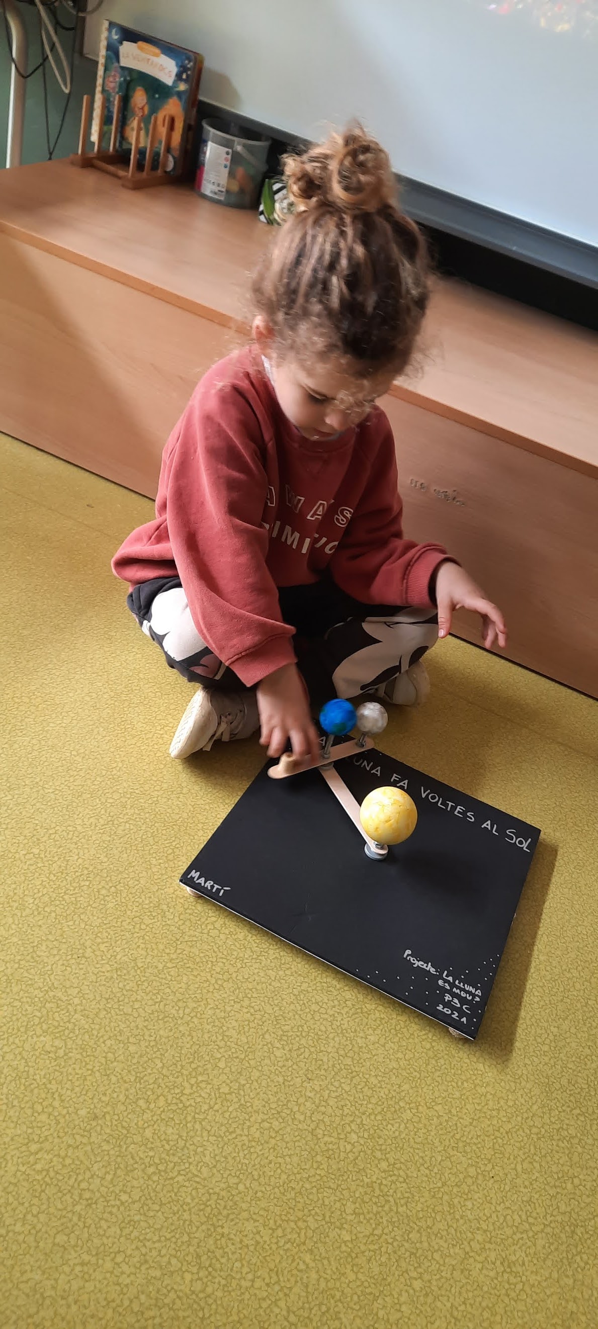 Ens ha portat una maqueta representativa on hi ha la Lluna, la Terra i el Sol i on clarament podem observar els moviments de rotació, translació i podem treballar quan és de dia i de nit. També ens ha portat imatges on veien la forma de la lluna, la seva mida, i com un metorit impacta sobre la lluna creant cràters.